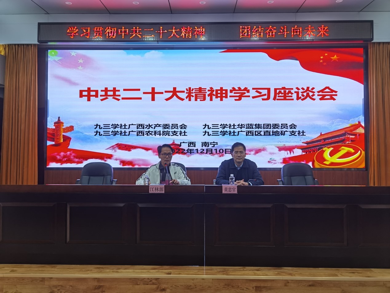 2022年12月10日,九三学社广西水产委员会、华蓝集团委员会、广西农科院支社、广西区直地矿支社四个区直基层组织社员共60余人开展“学习贯彻中共二十大精神 团结奋斗向未来”主题教育活动。